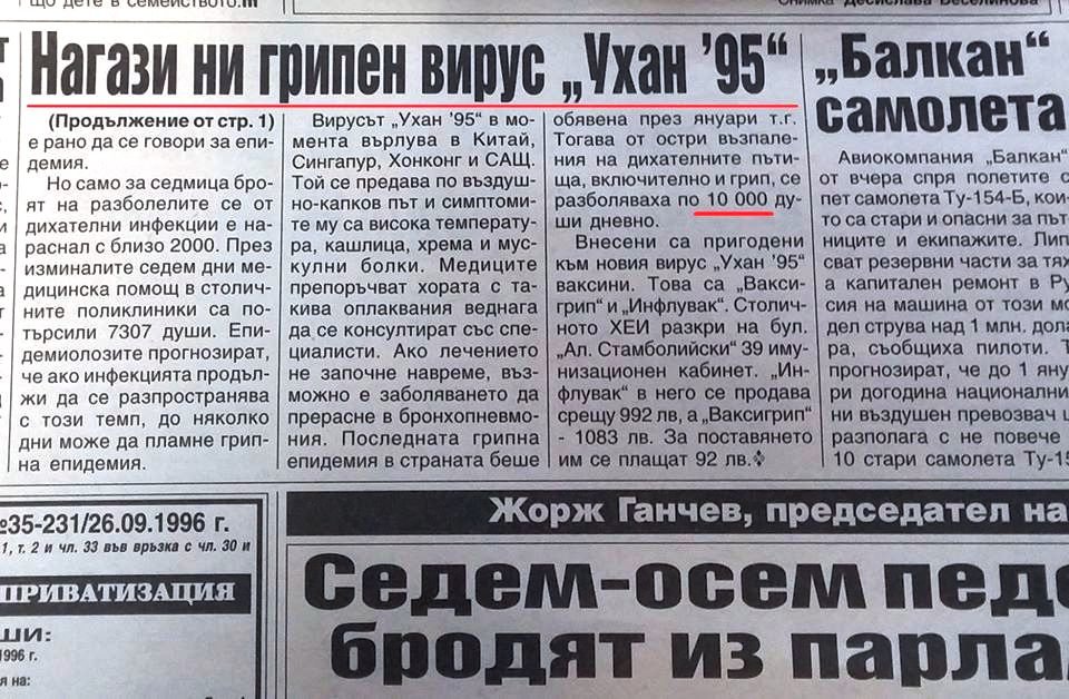 От материала в "Труд" разбираме, че през октомври 1996 г. вирусът "Ухан'95" върлува основно в Китай, Сингапур, Хонконг и САЩ, но по това време у нас вече са потвърдени първите положителни проби на новия грип.